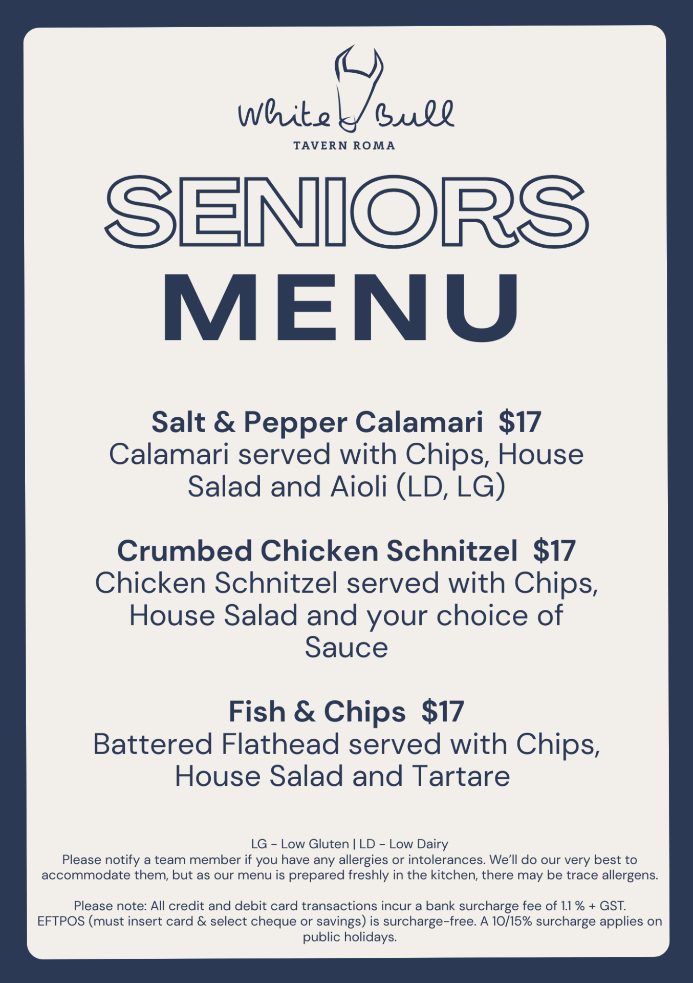 Our kitchen offers a variety of delicious food from specialty Pizzas & Pasta to a selection of diverse meals to suit the whole family. Along with a widely ranged menu, there is guaranteed to be some tasty Dishes of the Day created by our talented chefs. White Bull Roma has a wonderful family atmosphere with plenty of kid’s meals to choose from.
